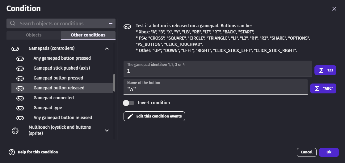 • If your game is multi player, it's a good idea to use the Gamepad connected condition to check which gamepads are connected. You could store in a variable the gamepad number associated to a player. You can also force the first player to use the Gamepad 1, and the other player to use Gamepad 2.