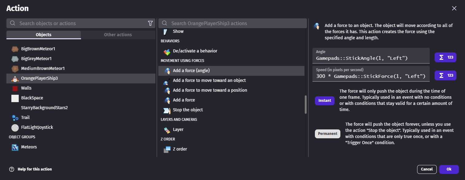 Gamepads::StickAngle and Gamepads::StickForce expressions can be used to apply a force on an object.