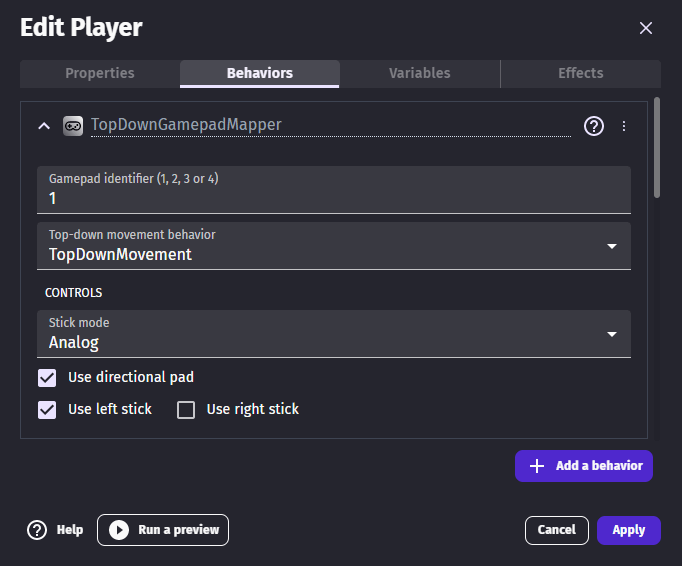 The "3D platformer gamepad mapper" behavior can be added to a 3d physics character to make the character move according to player inputs automatically.